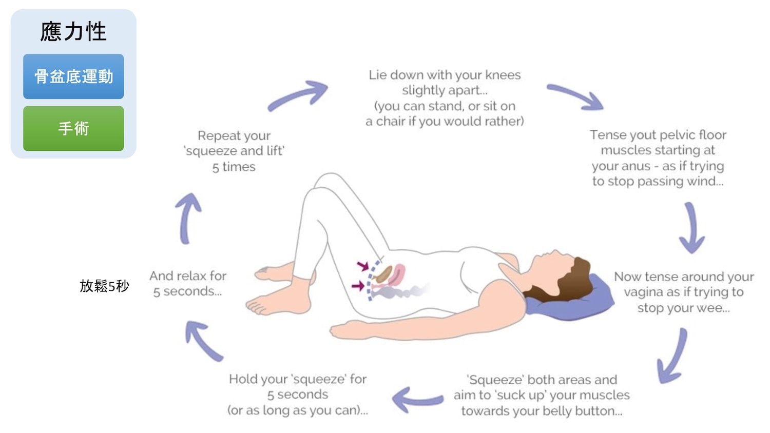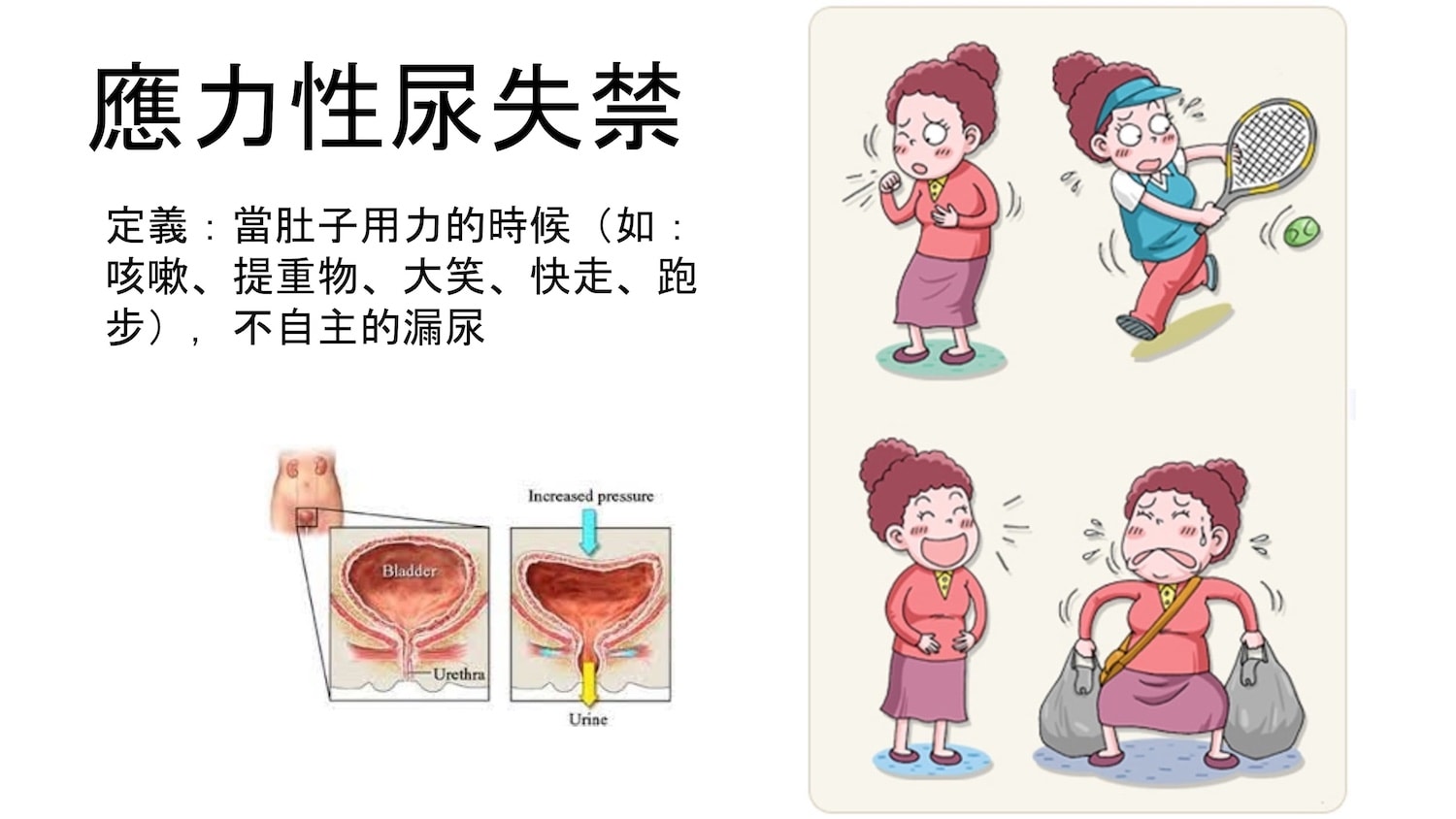 • 應力性:在腹壓增加時漏尿,手術為最有效治療