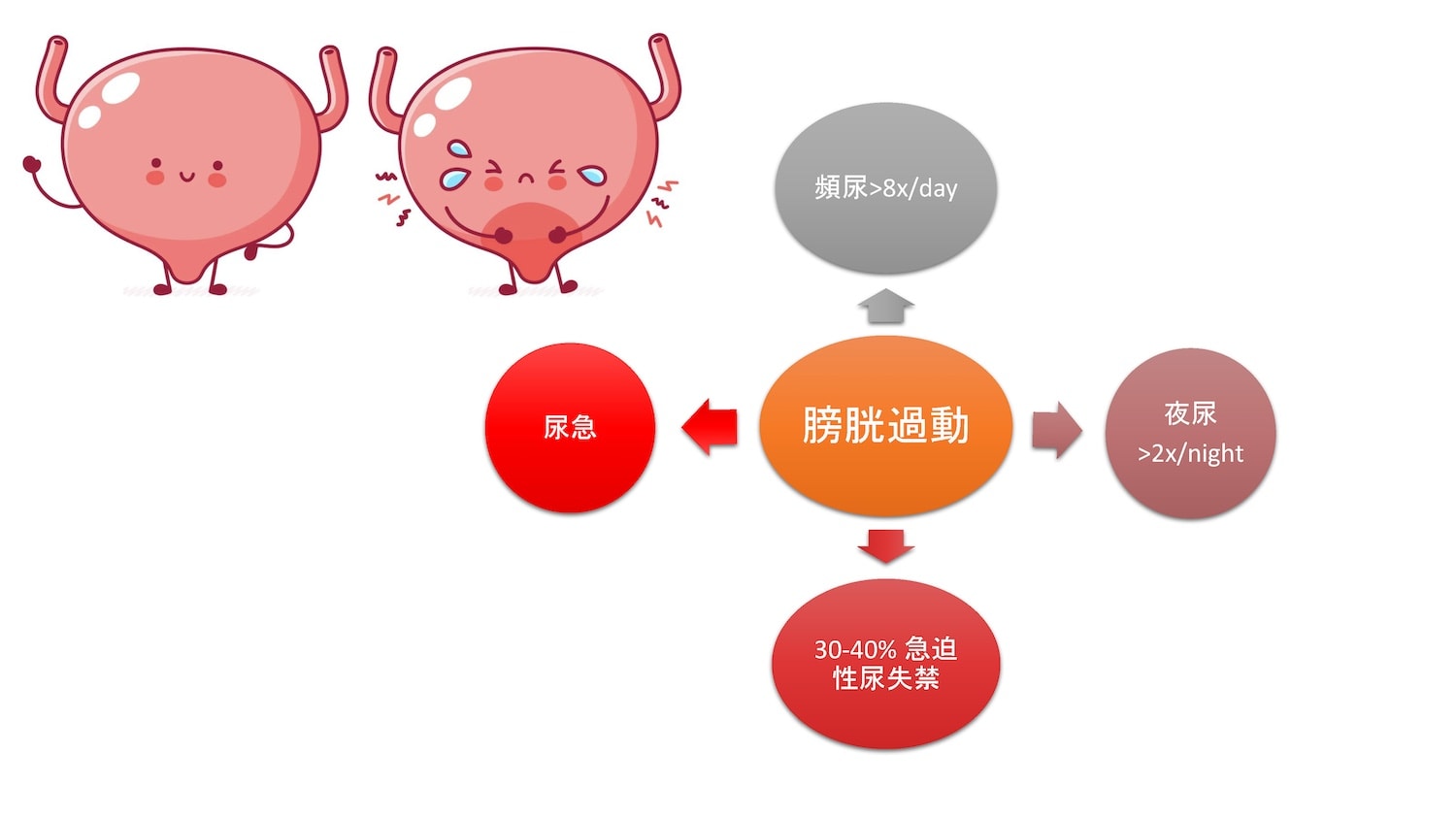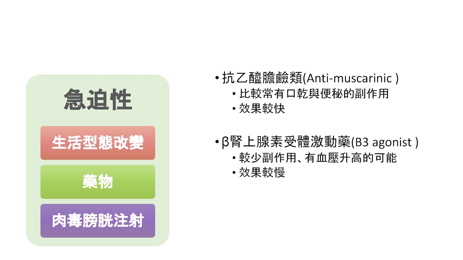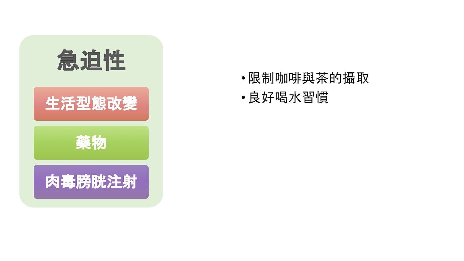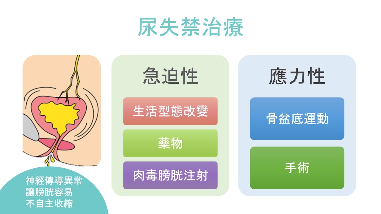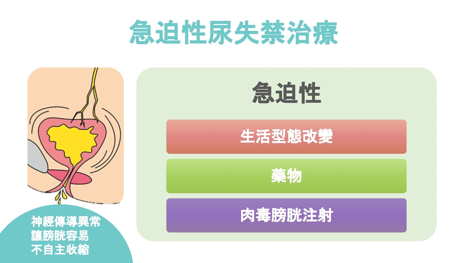 • 急迫性:忍不住尿意時漏尿,藥物為主要治療